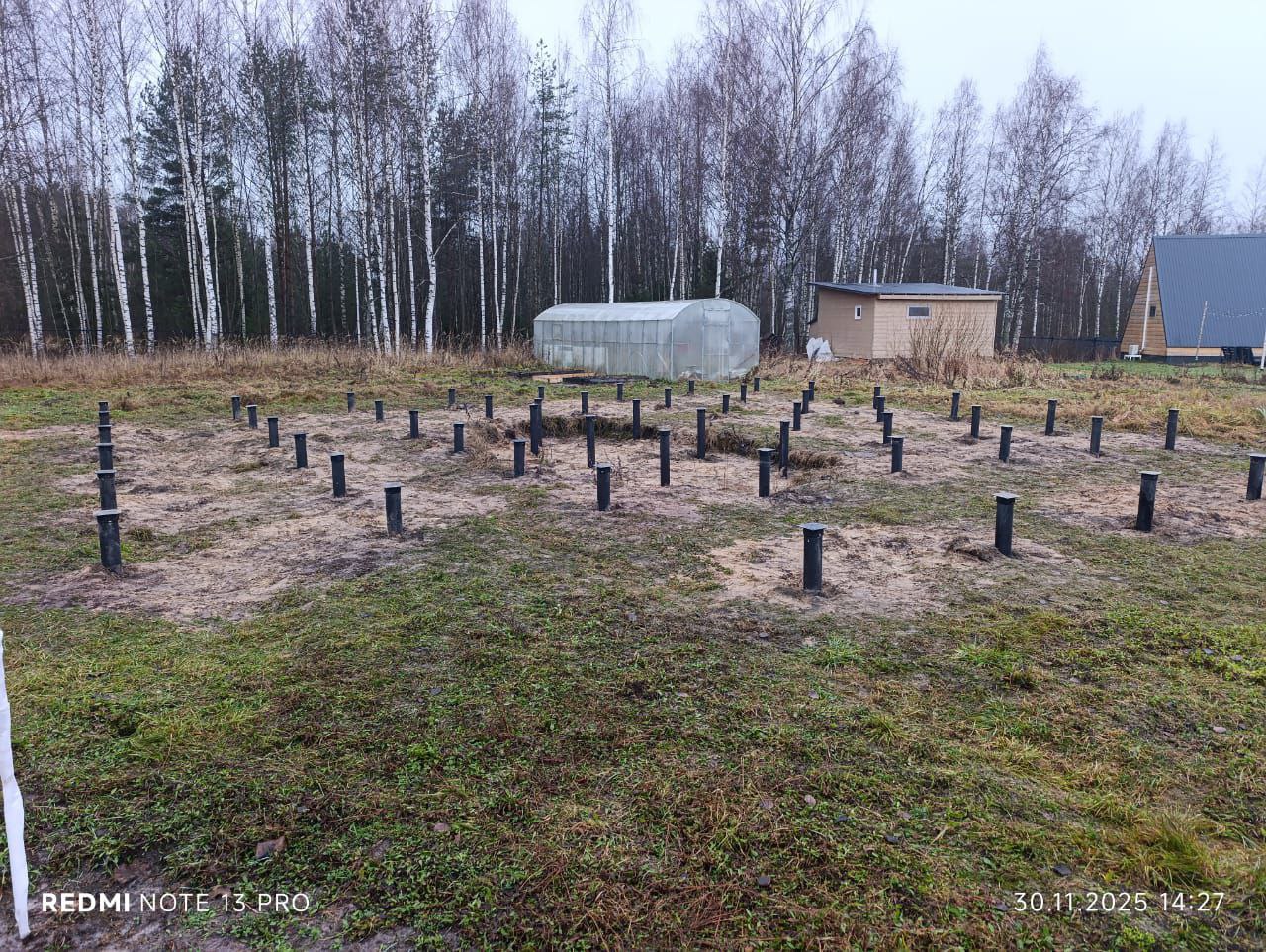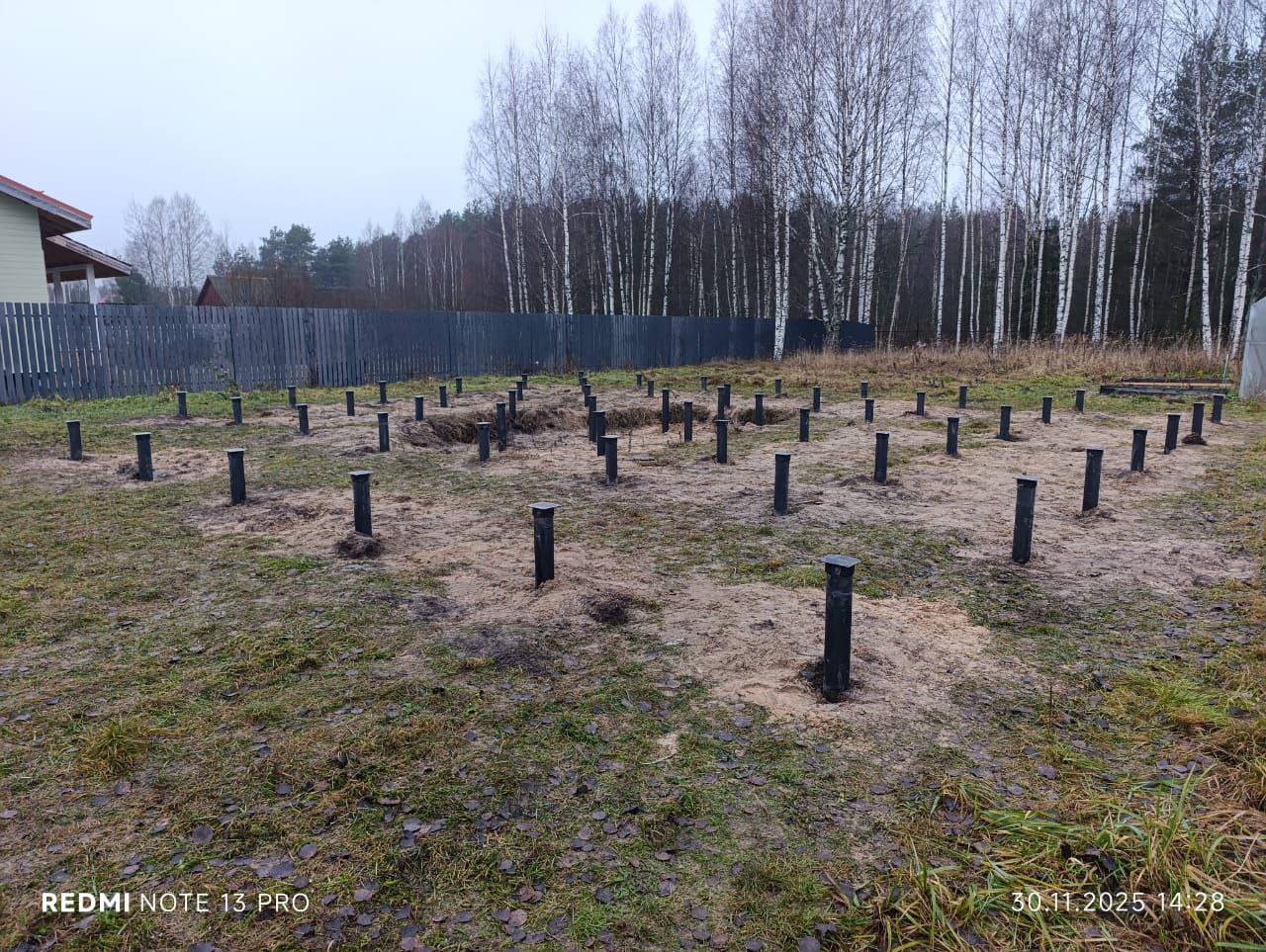 Выравнивание: Все сваи были обрезаны до единого горизонтального уровня. Этот этап необходим для создания идеально ровной плоскости для дальнейшего строительства дома.