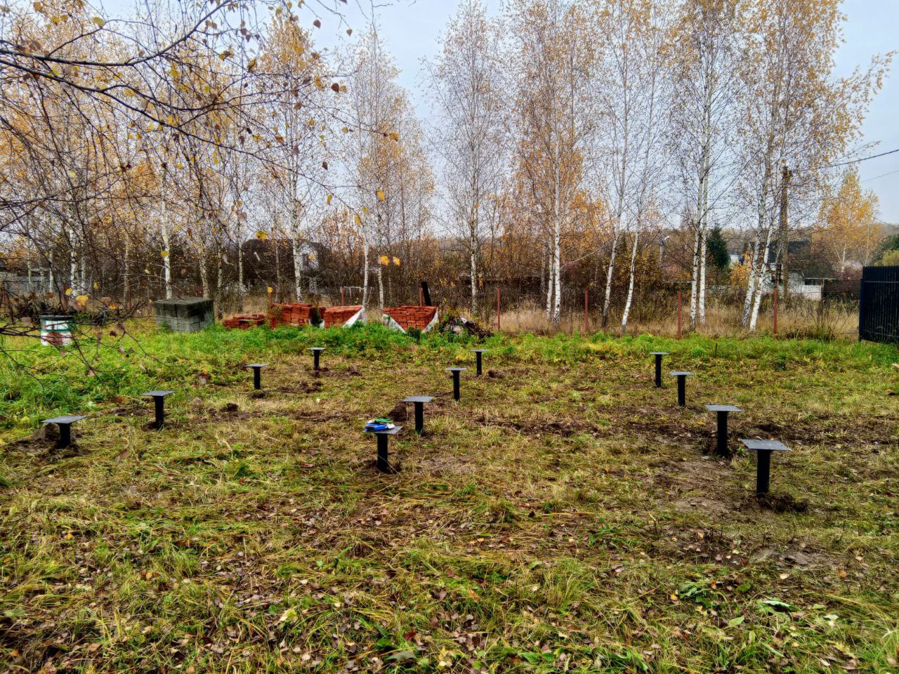 2. Монтаж свай: Далее последовало вкручивание всех двенадцати винтовых свай в грунт. Монтаж проводился с применением специализированного оборудования, что гарантирует правильное и плотное вхождение сваи в несущие слои грунта.